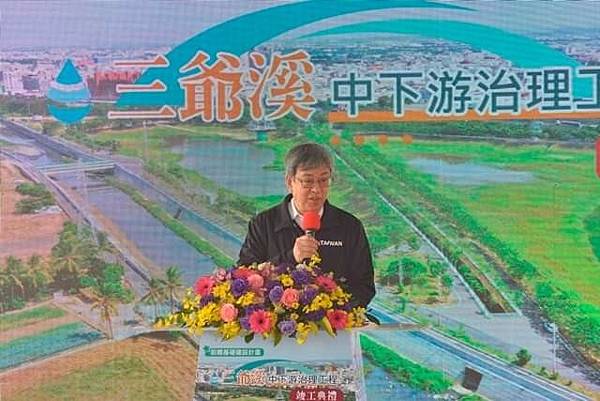 陳建仁院長首先提到,他的媽媽是台南人,老家就住在東區東門城附近,三爺溪的整治成功,是在賴清德及蘇貞昌兩位前院長的支持之下,納入中央前瞻基礎建設計畫,中央與地方齊力,讓原本要七年才能完工的工程,提早三年就能完成,這項成功相當不簡單。