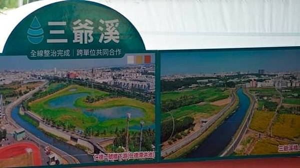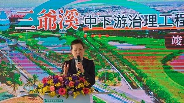 南市府為改善三爺溪排水問題,與水利署共同合作投入分段整治,感謝總統蔡英文特別指示水利署投入人力經費,在中央大力支援下,整治工程期程由預計的114年提前至111年底完工,有效改善周邊淹水情形,大幅提升防洪能力,並使周邊人口密集地區與工業區,可以免除淹水噩夢。