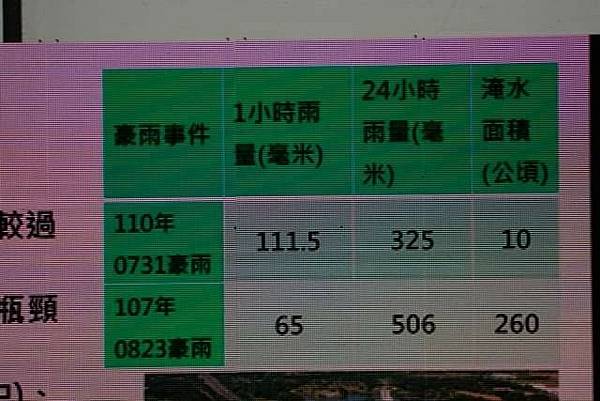 黃偉哲表示,人說介紹產品時要講使用前及使用後的差異,三爺溪整治前和整治後的差異,數據會說話,前(110)年0731豪雨的時雨量和多了107年0823豪雨的將近一倍,但因為三爺溪的整治工程,讓淹水面積縮小了20多倍。
