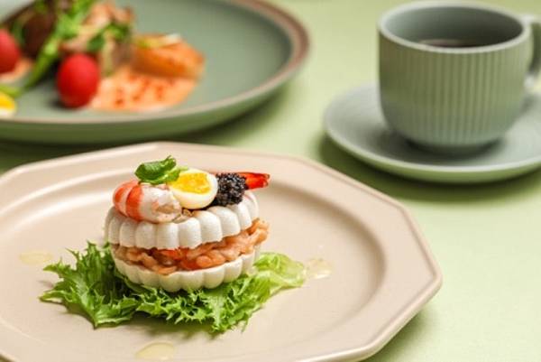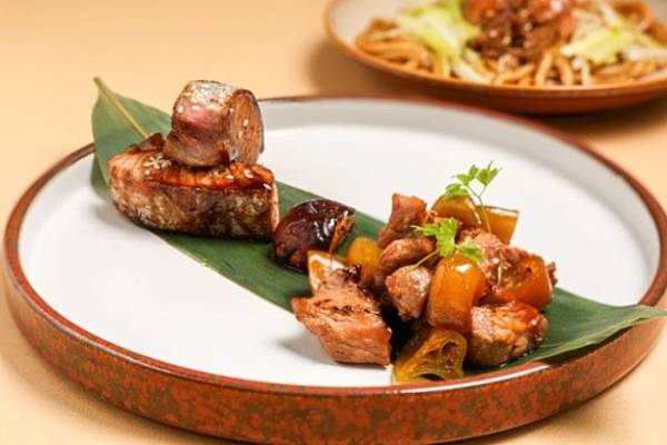 花時間-宜蘭傳藝「照燒醬烤鮪魚腹拼蘭陽金棗梅花豬」鮪魚腹肉滿布油花,主廚以照燒醬調味後先烤後煮,將外皮裹上炙烤焦糖色,接著加入酥炸梅花豬與宜蘭金棗下鍋爆炒,整體清酸微甜、香氣逼人,雙人房一泊二饗專案價4,950元起。台南館「香煎鮪魚腹、干貝、蝦佐白酒鮭魚卵醬汁」選用油花豐厚的鮪魚腹肉、生食級干貝與新鮮海蝦一同香煎,再淋上主廚特製鮭魚卵醬汁,濃醇海味令人大呼過癮!另一菜品「雙魚檸檬盒」主廚將鮪魚腹肉與煙燻鮭魚拌入香料及酸豆夾入米餅中,再堆疊滑順的檸檬洋芋泥,入口淡淡酸氣襯托出魚肉的鮮美,細緻表現讓人驚艷!雙人房一泊二饗專案價4,577元起。