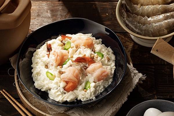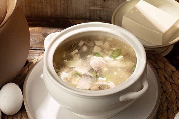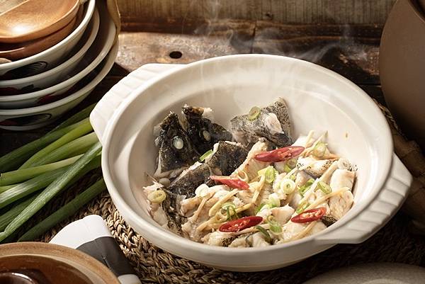 「吊片蒸手剁肉餅」袁東海主廚表示,舊時香港的水上人家為了保存捕捉到的漁獲,自製「吊片」,他也復刻出這道美味,將魷魚串起來日曬到半乾、半濕以留住鮮甜味,配上3分肥7分瘦的梅花肉切細丁,爽脆的荸薺切粒狀,整道菜富含海味、肉味,表面再放上鹹蛋黃一起蒸煮,吃起來鹹香肉嫩、多汁爽口。「砂鍋薑蔥香焗龍虎斑」使用砂鍋烹調,具有保溫功能,簡單地以薑、蔥鋪底,加入活的龍虎斑一起焗熟,鎖住鮮甜肉汁。「古法魚肉羹」以老粵菜的作法,使用台南人熟悉的無刺虱目魚,再加入豬肝、冬筍、草菇、嫩豆腐及豆仁,再選用上湯炮製而成,味道豐富又有層次,是難得一嘗的古法粵菜新滋味。