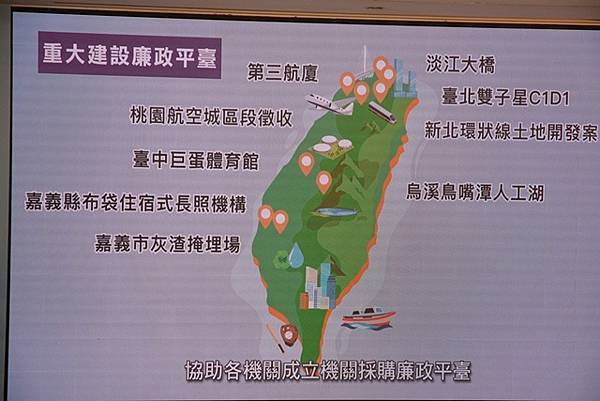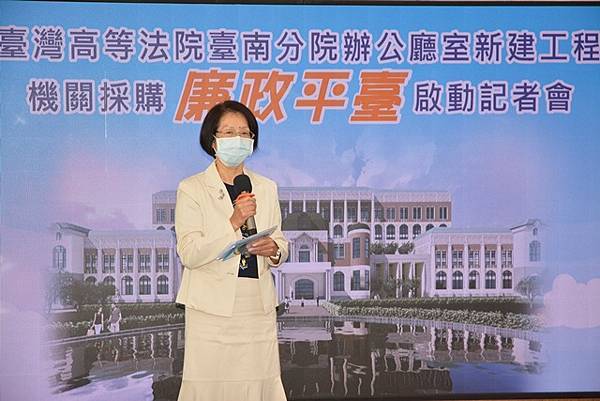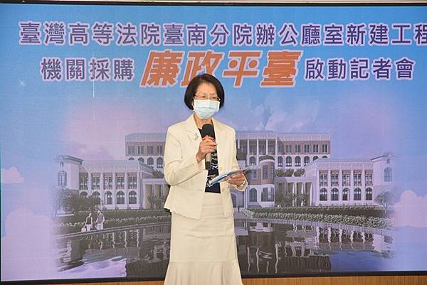 以安平再生水廠為例,指出因為廉政平臺發揮作用,讓工程得以順利完工並在今年旱期透入給水。不論是業主或得標廠商,施工過程若碰到任何問題,都可以提到廉政平臺來處理,在司法人員監督下,能夠減少不必要的障礙跟困擾。