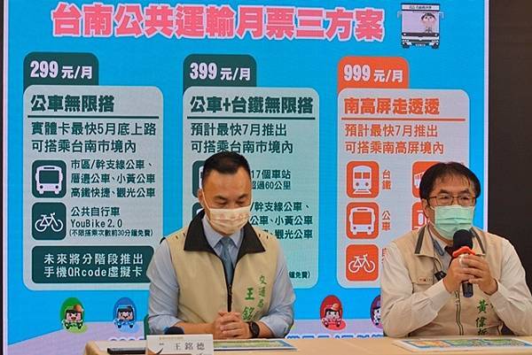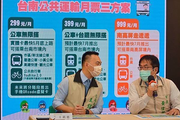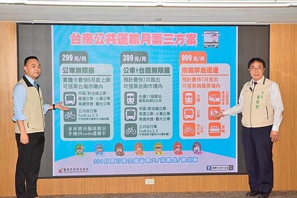黃偉哲再指出,未來在台南將有「南高屏公共運輸走透透999」、「大台南公車無限搭299」及「公車+台鐵無限搭399」3種公共運輸月票方案,民眾可擇最符合自己需要的票種搭乘,市內月票納入境內台鐵後,雖也增加本府經費支出,但可望同步向中央加碼爭取補助超過5億元,除了補助搭乘費用,也配合同步爭取新一代的QRcode驗票機等設備,希望中央加速審議,用最快速度推出提供市民使用。