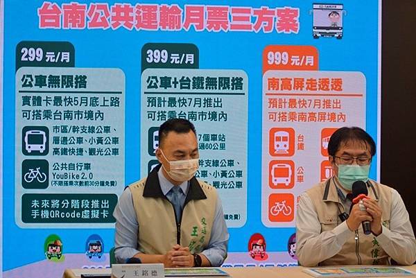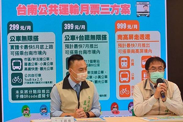 交通局長王銘德指出,發行月票牽涉層面甚廣,交通局緊鑼密鼓邀集轄內客運業者、票證公司、車機設備商等確認各項細節,已完成完整方案提送中央審查。因須同步進行票證程式修改、票機硬體換新等前置作業,「大台南公車無限搭299」實體卡部份最快可望在5月底上路,未來也會分階段推出手機QRcode虛擬卡,「公車+台鐵無限搭399」和「南高屏公共運輸走透透999」部分,因涉及台鐵配套進度,預訂7月推出。