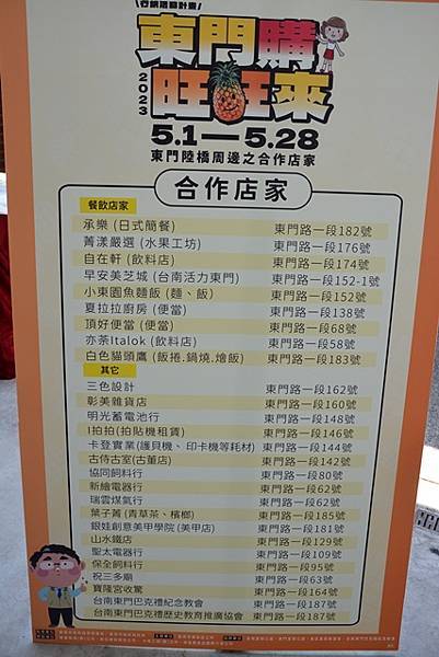 「東門購旺旺來」活動期間(112/5/1~5/28)於合作店家消費滿500元起,即可兌換鳳梨1顆(各合作店家分配數量有限,換完為止),讓民眾滿足心意甜,好運一整年!歡迎市民朋友一同共襄盛舉。