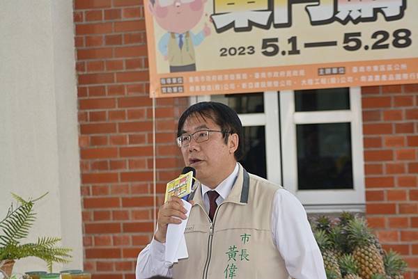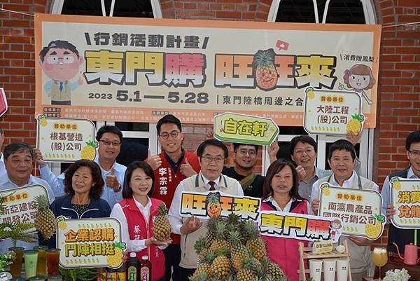 【柿子日報記者李玲/台南報導】台南市長黃偉哲今(28)日主持東區區公所2023「東門購旺旺來」行銷活動記者會,聯合東門路橋周邊鄰里商家,推出消費滿500元送鳳梨的優惠,要吸引民眾多來消費,助店家生意旺旺來。包括市議員蔡筱薇、曾培雅、李宗霖皆到場共襄盛舉,邀請民眾悠閒漫步於古色古香的東門町氛圍中,盡情享受逛街吃美食的樂趣。