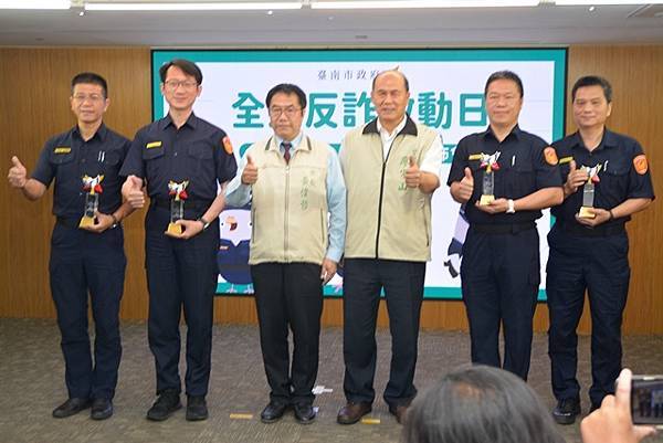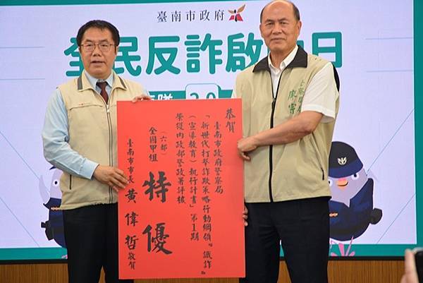 去年初臺南市在反詐宣導工作超前佈署,領先行政院打擊詐欺策略整合本市各局處資源,全國首創建立反詐宣導工作大平台,後續升級成為「打詐臺南隊」,共同研擬預防詐騙宣導策略,推動反詐宣導工作,在各局處總動員下,識詐宣導教育工作也獲得內政部警政署評核全國特優的佳績。
