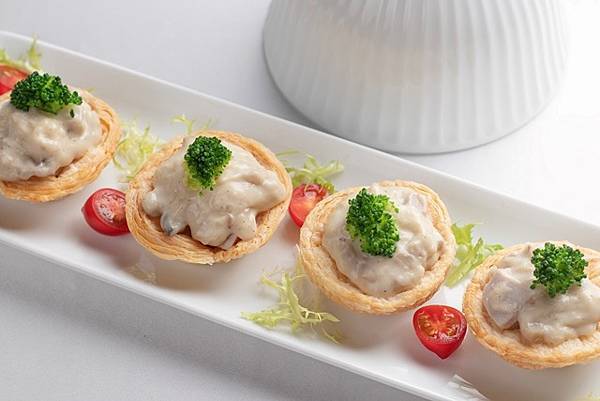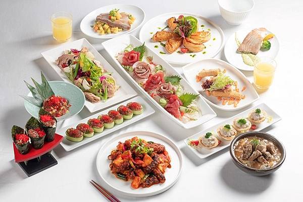 鮪魚在日式料理區也很常見,一口氣就推出8樣,鮪魚軍艦壽司、鮪魚握壽司、辣味鮪魚壽司、炙燒鮪魚手卷、山葵海苔鮪魚捲天婦羅、鮪魚南蠻煮、鮪魚丼、鮪魚茶碗蒸等。奶油鮪魚蘑菇酥盒,是法式料理中常見的熱前菜,以濃香的白醬拌炒鮪魚、蘑菇成為餡料,小巧造型,一口咬下酥香、爆漿,口中充滿大海的鮮滋味。鮪魚菲力的部位最適合最為排餐,肉質清爽彈牙不肥膩,且仍保有魚油香。香煎鮪魚排再佐以不同的獨家沾醬,風味迥異,別具特色,像是白酒蘑醬、海膽醬、橙香蛋黃醬、塔香蛋黃醬、鳳梨莎莎、青蔥芫荽青醬等輪流推出,每餐期提供2種搭配方式,任君選擇,讓您每一次來吃都有新的搭配與驚喜。鮪魚一整隻都是寶,其中用鮪魚頭富含DHA很適合熬湯,濃郁香甜的湯底放入炸到酥脆鮪魚柳,台式土魠魚羹化身成為升級版的鮪魚羹,每吃一口都有莫名的高級感。香辣鳳梨鮪魚尾以南洋料理手法烹煮,鮪魚尾運動量最高,含豐富膠原蛋白,先將鮪魚尾炸到金黃,加入鳳梨、一起拌炒出酸、甜、辣的多重滋味,肉質Q彈鮪魚尾,讓人越嚼越香。