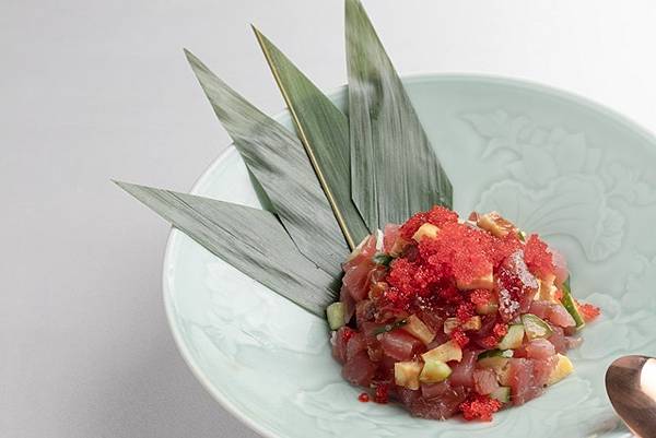 「鮪魚套餐」中最具特色的是「黑鮪魚旬彩刺身」是用到許多人愛吃肥美的黑鮪魚腹部、身體的部位,讓鮮味盡現。「雲丹黑鮪握壽司三品」,選用腦天、赤身、跟最肥美的大腹三種黑鮪魚部位,當中腦天是比較少被使用的部位,因為口感軟綿、稀有又價格貴,透過炙燒的方式呈現壽司的最佳口感。以上價格須另加10%服務費。為維持用餐品質請事先訂位06-512-1807。