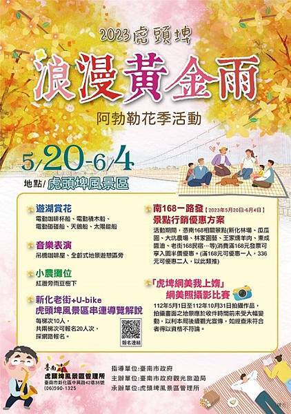 觀旅局代理局長林國華表示,2023虎頭埤阿勃勒花季,將於5月20日正式登場,至6月4日止,活動中以遊湖賞花(電動咖啡杯船、電動積木船、電動碰碰船、天鵝船)、音樂演出、小農市集、新化老街+U-bike+虎頭埤風景區串連導覽解說、南168一路發景點行銷優惠方案、「虎埤網美我上媠」網美照攝影比賽為主軸辦理,以提供市民及來訪臺南之觀光客一個歡樂的「金黃色嘉年華」。