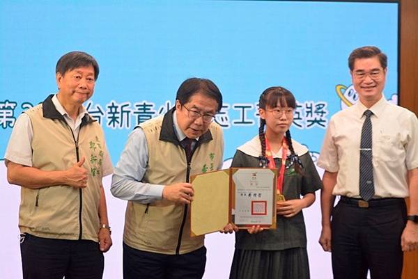 黃偉哲表示,台南是志工的城市,185萬人當中就有10萬人參與志工服務,這次獲獎的學生,願意付出寶貴時間讓城市變得更好,可說是青少年志工楷模。他也感謝台新青少年基金會,長期與市府協力合作,期盼未來有更多年輕朋友投入志工服務,一起打造台南成為更友善溫暖的城市。