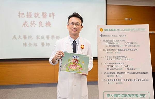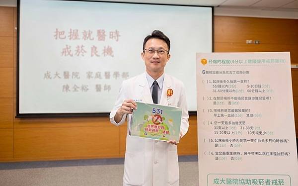 成大醫院家庭醫學部陳全裕醫師表示,研究指出所有吸菸者中約有一半想戒菸,依據年齡、性別、地區等特性,從30-70%不等,尤其是身體不適時更容易產生戒菸的念頭。但真正付諸行動的戒菸者卻很少,即使開始戒菸,能堅持1星期就算很厲害,幾乎所有人都會認為是意志力不足導致。陳全裕醫師說明,研究顯示戒菸動機及成功與否,和尼古丁成癮度高度相關,所以必須好好處理尼古丁戒斷症狀,而尼古丁戒斷有藥物可以治療,療程約2-4個月就可完成。