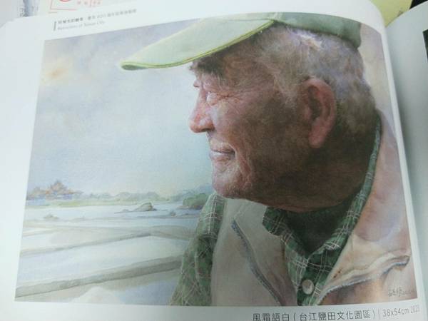 林毓修的風霜語白作品,描述七股的鹽田,遠遠望去似池塘,農民滿臉的風霜,但其溫潤的色彩及微妙的神情,寓意雖經歷了風霜,依然感到非常的知足及美滿。