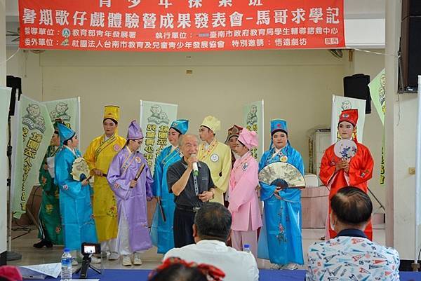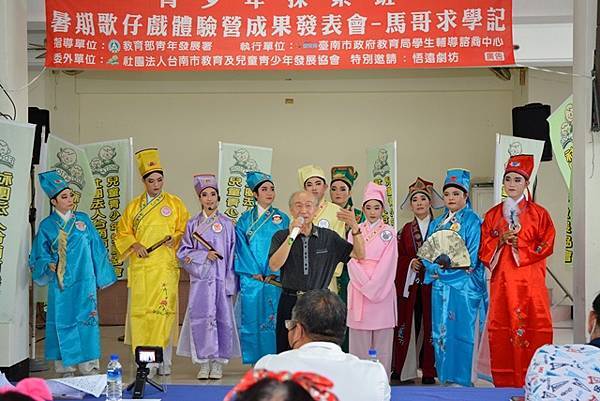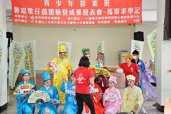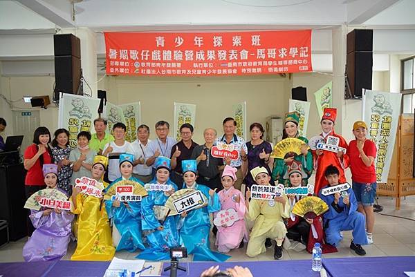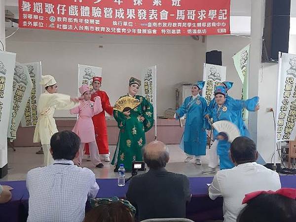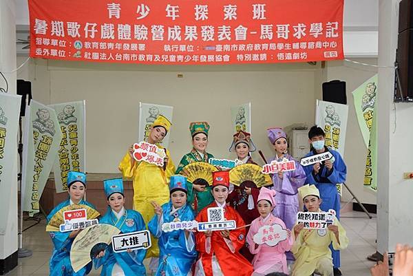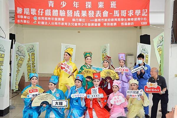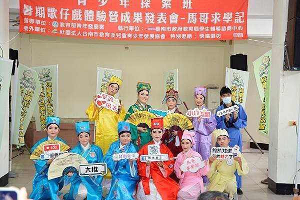 【柿子日報記者李玲/台南報導】社團法人台南市教育及兒童青少年發展協會(以下簡稱兒少協會),辦理為期三日的歌仔戲體驗營,並於十四日中午11時假中頭社區活動中心舉行成果發表會,學員們在藝師的指導下粉墨登場,彩妝帶來《馬哥求學記》精彩表演,扮相和走位,令人為之驚艷
