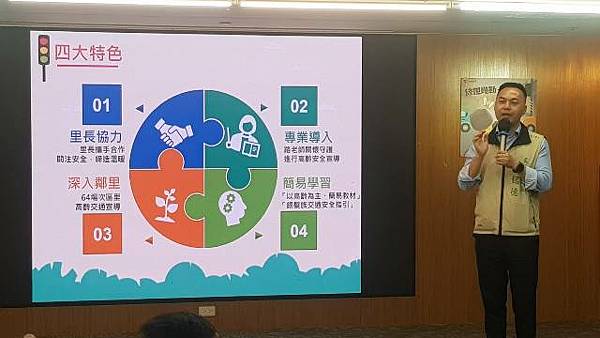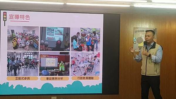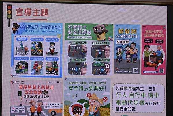 今年度與交通部合作推出的高齡交通安全宣導活動,預計自本(7)月起巡迴本市32個里,共計辦理64場宣導活動,宣導活動涵蓋多個主題,包括行人、自行車、汽機車、電動代步器等正確用路安全知識,及搭配交通部制定的「銀髮族交通安全指引」等,設計製作以高齡者交通安全為主題的宣導教材。以淺顯易懂與生動活潑的互動方式,搭配路老師說學逗唱的方式,提升長輩學習意願及加深學習印象,參加活動還有神祕小禮免費送,歡迎長輩們踴躍參加。