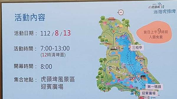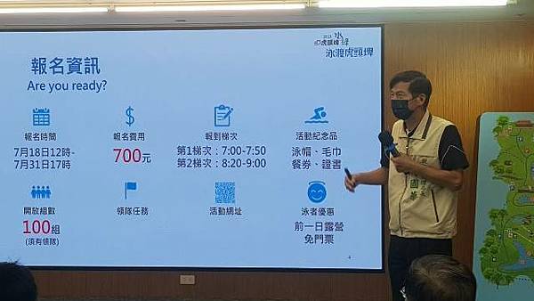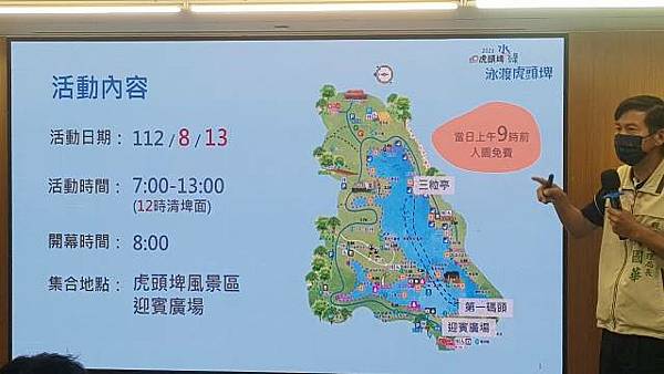 臺南市政府觀光旅遊局代理局長林國華表示,人生有許多必做清單,今日之後「泳渡虎頭埤」可以是其中一項,1,500公尺的泳渡距離相當於標準泳池來回30趟,算是一項有挑戰活動,相信這第一次辦理的泳渡活動絕對是秒殺級,7/18中午開放報名,大家一定要把握機會手刀報名,為配合本次活動,8/13當日9點前還可享入園免費的優惠,為確保每位泳者的安全,活動要求每位泳者要自備救生浮標、哨子、配戴活動泳帽,水上設有浮台、SUP供泳者休息,每200公尺配一艘救生艇及2名救生人員,如果真的游不完也沒關係,只要脫下泳帽或吹哨子求救就會有救生人員前往救援。活動限團體報名,每組限5-8人,每名報名費用700元,歡迎符合資格的朋友們組隊報名參加,與親朋好友們共創暑假特別的回憶。