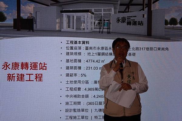 公共運輸處長吳俁之表示,永康轉運站工程總經費近5,000萬元,其中爭取到中央補助近4,250萬元,工期約1年,預定明(113)年第3季完工啟用。