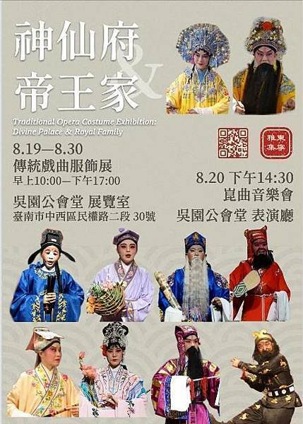 【柿子日報記者李玲/台南報導】即日起至8月30日,東寧雅集與臺南市政府文化局合辦於吳園公會堂展覽室舉辦傳統戲曲服飾展,以戲曲中兩大演出背景──天上神仙世界與人間帝王日常服飾為主題,展現戲曲服飾的多彩多姿與多元層次;仙界以八仙為主題。