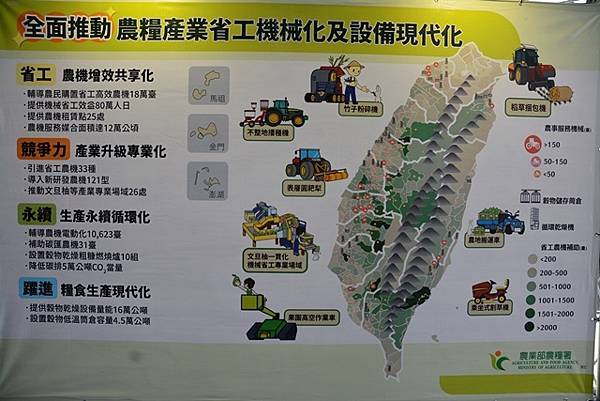 政府重視農業機械化 近四年投入近百億元打造機械化經營環境 農糧署說明,為打造適合推動機械化的環境,在輔導農民利用機械從事農耕的同時,配合推動農機教育訓練,以確保農民使用農機安全及延長農機使用壽命,也於雲林及屏東建置曳引機駕訓場,來減少農機行駛道路發生事故,保障農民及用路人安全,並且精進農機性能測定,以提升農機性能保障農民使用農機權益。