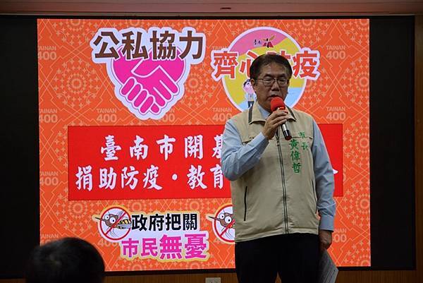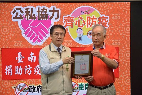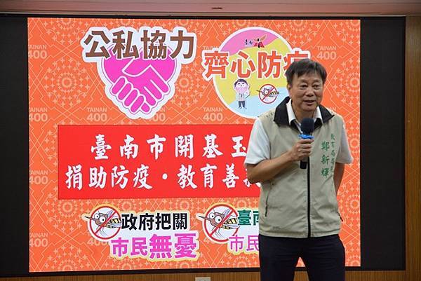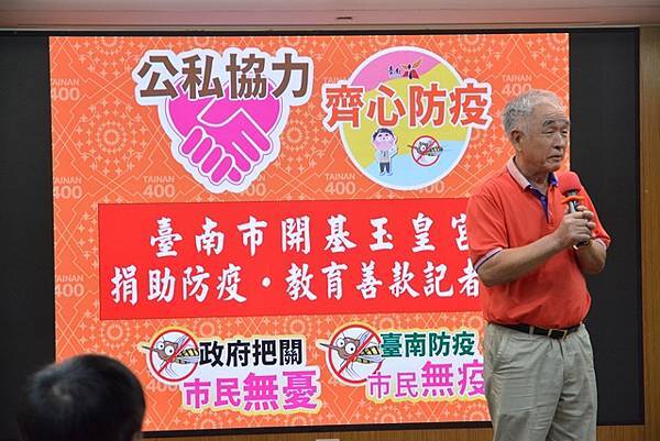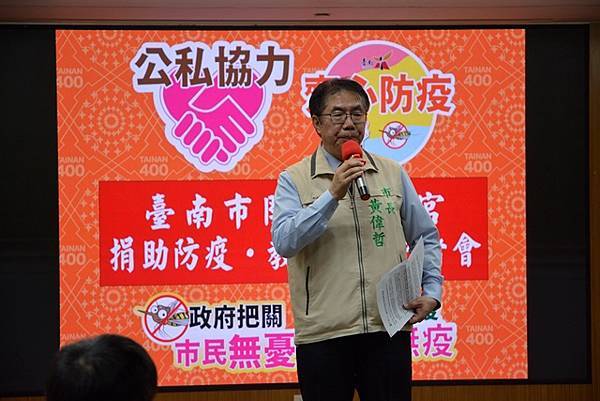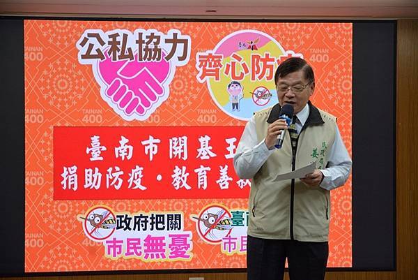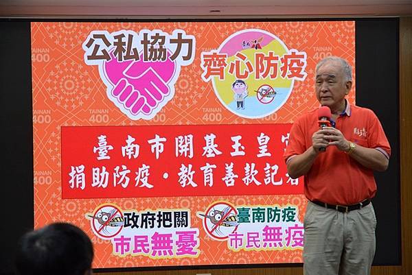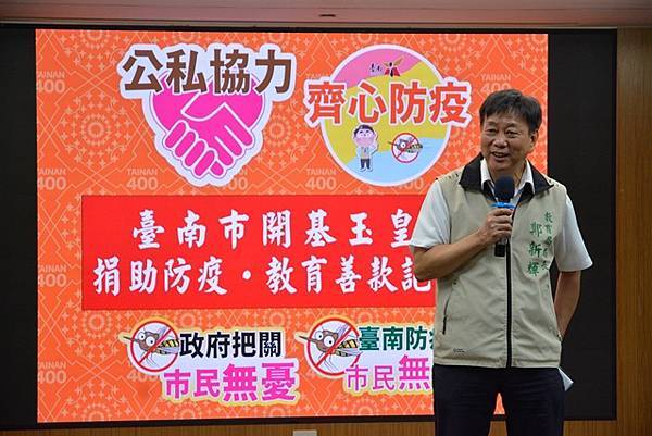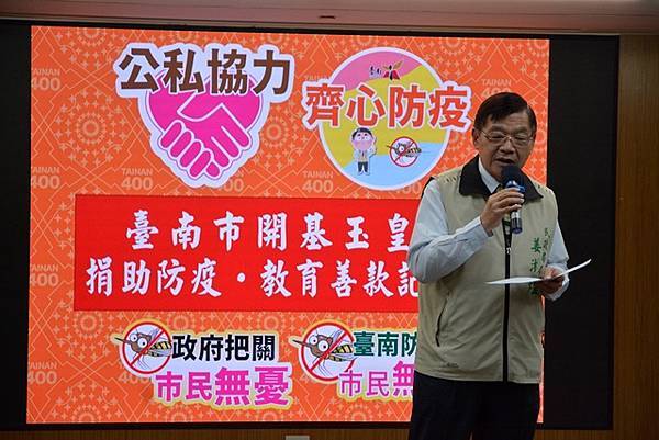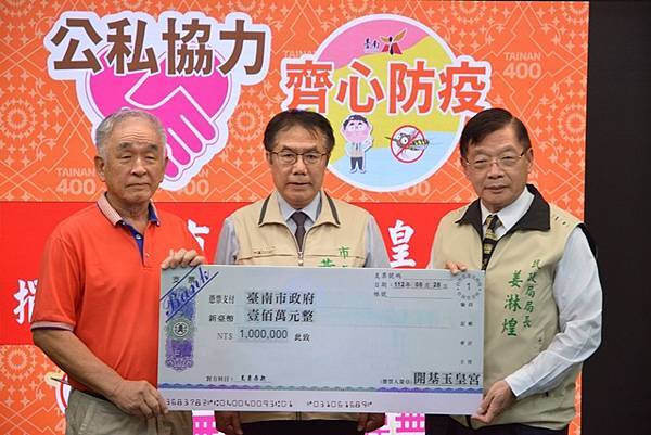 黃偉哲強調,現值登革熱疫情升溫,呼籲市民朋友持續落實「巡、倒、清、刷」等防疫作為,也祈求天公有好生之德,保祐台南市登革熱疫情早日消除,市府將與開基玉皇宮攜手合作,並善加運用經費,讓大愛與關懷傳遞下去。