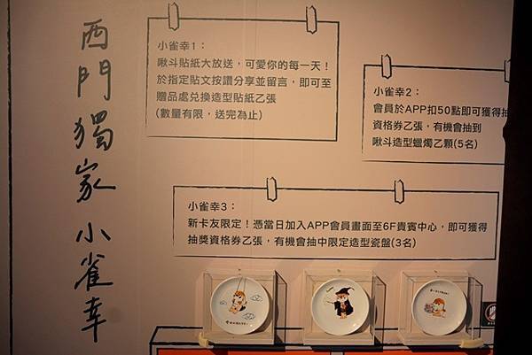 獨家大放送三部曲,小雀幸1,啾斗貼紙大放送展期間於臉書貼文按讚留言即可出示截圖至贈品處兌換限量獨家貼紙乙份(限量);小雀幸2,會員於APP扣50點即可獲得抽獎資格券乙張,有機會抽到啾斗造型蠟燭乙顆(5名);小雀幸3,新卡友限定!憑當日加入APP會員畫面至6F貴賓中心即可兌換APP抽獎券乙張,有機會抽中限定造型瓷盤(3名)!誠摯的邀請每位喜歡欣賞美的事物的你一同觀賞。
