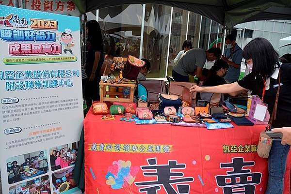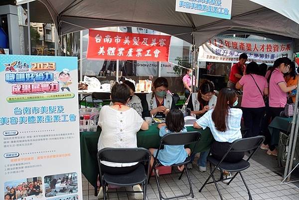 今日職訓成果展現場有德鍵企業有限公司附設職業訓練中心、伽碩企業有限公司附設職業訓練中心、台南市美髮及美容美體業產業工會、台南市時尚造型規劃設計職業工會、社團法人台南市觀光協會、群偉國際有限公司、台南市服飾設計職業工會、台南市木工業職業工會、訊亞企業股份有限公司附設職業訓練中心、社團法人臺南市勞工領袖協進會….等單位參與,以動態表演及靜態成品展覽呈現各類課程學習成果,其中大台南總工會展示以寶石、編織技巧的手作品及提供手作 DIY 活動;嘉藥學校財團法人嘉南藥理大學「到府坐月子服務培訓班」中高齡專班學員,示範「產婦按摩」技巧;中華醫事科技大學學員展示深受年輕人及民眾喜愛的翻糖造型蛋糕作品;群亞國際股份有限公司附設職業訓練中心「影音行銷企劃製作班」於現場播放學員微電影作品;頑皮抱身障者工作室帶來造型氣球教學,現場互動熱鬧滾滾,今日吸引近千名民眾及親子參與成果展活動。