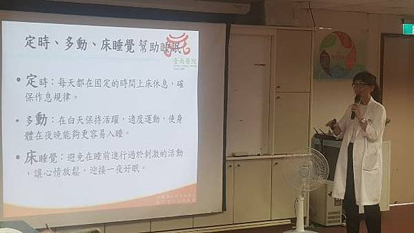 本院自2020年起,積極協助個案進行全方位的睡眠治療。經由睡眠專科醫師的評估,協助個案提升睡眠質量,治療包括西醫手術、陽壓呼吸器使用、營養衛教、身心科評估診療及中醫的針灸與中藥治療。根據本院的數據分析,這些個案的睡眠效率由79.8%上升至89.3%,睡眠總時數也有所增加;從2022年開始,提供睡眠時間小於6.5小時的個案加入睡眠衛教和穴位自我按摩的課程,包括百會、雙側風池穴、雙側內關穴、雙側神門穴、雙側三陰交穴、中脘穴,共十個穴位按摩,處置前後的分析顯示,衛教與穴位自我按摩改善入睡時間及增加這些個案的總睡眠時間,協助個案提升睡眠及生活品質。