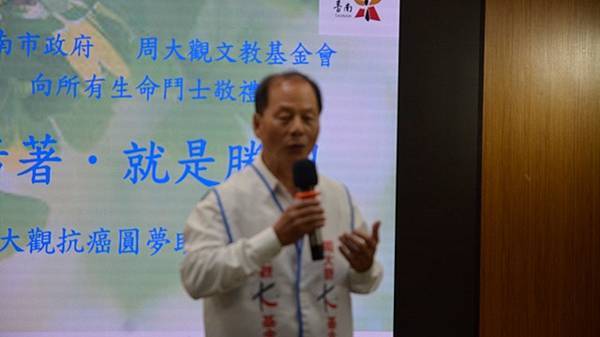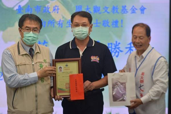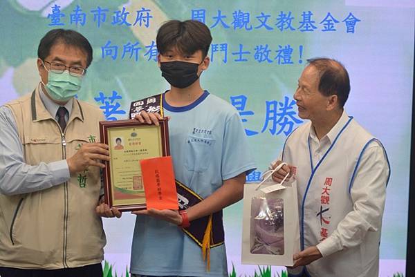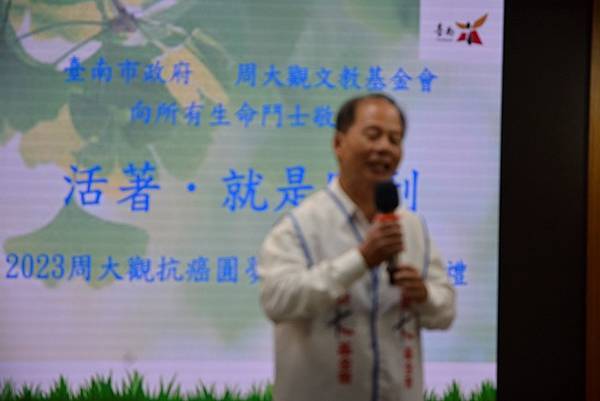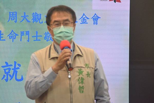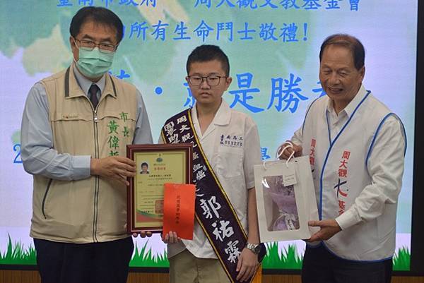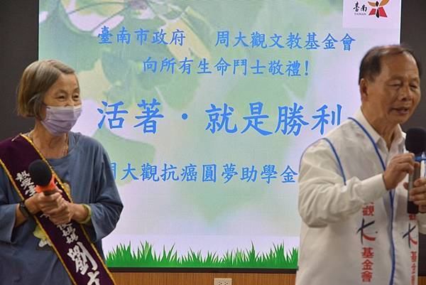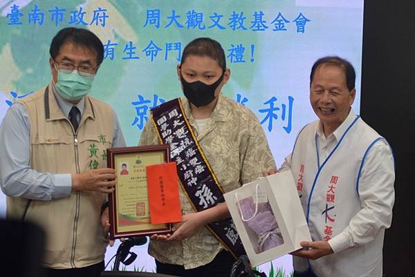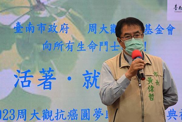 黃偉哲表示,看見今日受獎勇士們努力抗癌、逐夢的過程令人動容,和他們比起來,其他人實在太幸福,沒有悲觀的理由;他也特別謝謝周大觀基金會創辦人周進華及董事長郭盈蘭將小愛化為大愛,頒贈助學金,給予罹癌學生,一臂之力。黃偉哲強調,未來市府會持續協助並配合基金會,讓這些生命鬥士的故事,傳遞給更多人,為社會帶來啟發和能量,進而也吸引更多人挺身而出,付出愛,延續周大觀的精神。