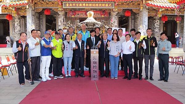 圖為副市長葉澤山出席頒發「宮廟博物館認證」給三寮灣東隆宮,由董事長侯正仁(右)及副董事長陳松山代表接受。
