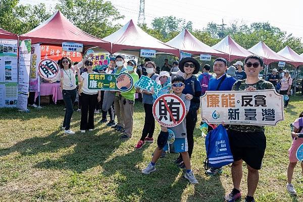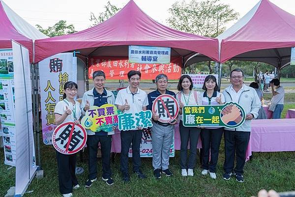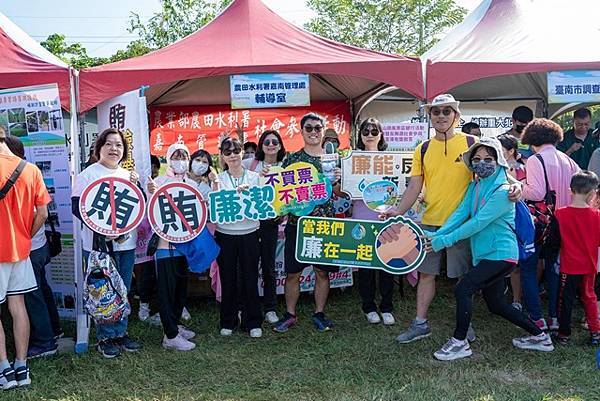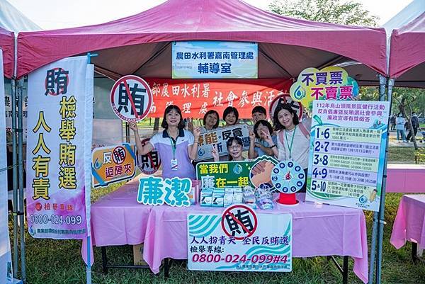 當天除健走活動外,主辦單位並規劃「食農教育園遊會暨走讀水圳新書發表會」,本處輔導室設攤辦理「反貪倡廉反賄選社會參與廉政宣導」暨有獎徵答活動,為明年第16任總統副總統及第11屆立法委員選舉反賄選宣導,傳達不買票、不賣票、不受假訊息、境外勢力影響及杜絕選舉賭盤,參加民眾只要旋轉輪盤答對問題並與立牌拍照即獲得精美小禮物一份,現場民眾參與踴躍,大排長龍,歡笑聲不斷,充滿歡樂溫馨氣氛好不熱鬧。