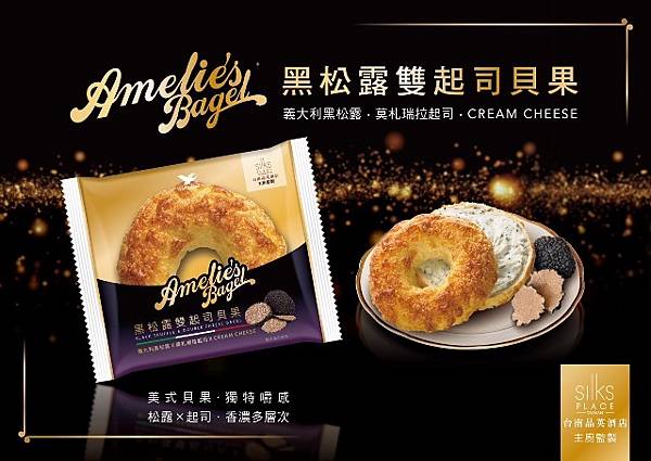 Amelie’s Bagel切達起司貝果與藍莓寒天貝果一直以來都是廣受網友好評的經典貝果,歷經逾半年的開發、多次的口味調整,11月推出全新口味「黑松露雙起司貝果」,由知名的台南晶英酒店主廚監製,在原料跟製程上下足功夫!貝果以沸水工法及專業酵素配方,使得貝果口感外韌內Q,打造出Amelie’s Bagel的美式貝果獨特嚼感。內餡則使用義大利產夏季黑松露,搭配擁有優質乳源的紐西蘭進口CREAM CHEESE,一打開包裝就能聞到香濃的黑松露香氣,頂部覆蓋紐西蘭莫札瑞拉起司進行烤焙,讓起司與黑松露香氣融入整體貝果中,視覺嗅覺雙重誘惑,打造出多重美味層次的「黑松露雙起司貝果」!