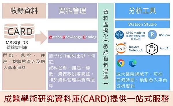 【醫療大數據】的運用,是精準與智慧醫療的基礎與助力。其中的「成功醫CARD通,尋寶e健通」,展示成大醫院積極活化蘊藏35年的臨床數據,跨域打造「成醫學術研究資料庫(CARD)」,近期從中篩選180萬筆健康成人數據,進行骨骼肌質量指數研究,建構全國首部健康族群之肌肉變化主題式資料集,除作為高齡者健康指標評估標準外,也能早期發現潛在跌倒與肌少症的高風險者,讓醫療團隊早期介入維持病人健康生活品質。