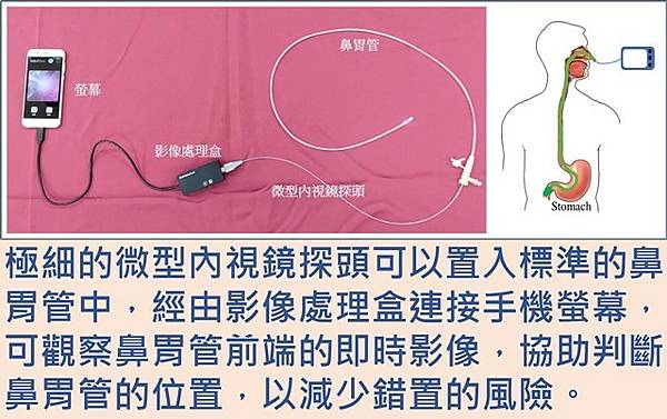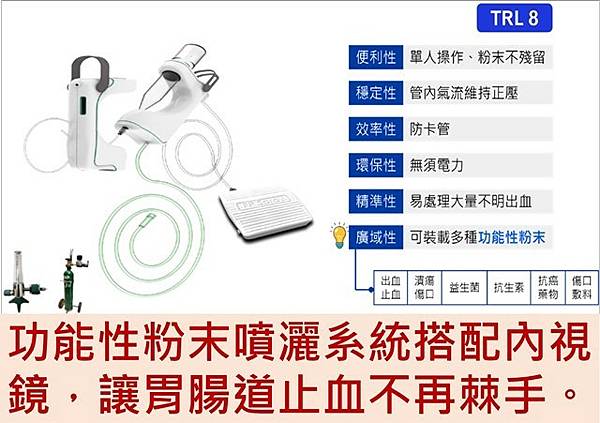 胃腸道出血有極大的生命威脅風險,「功能性粉末噴灑系統」結合內視鏡的精準與傳統藥物的安全有效新劑型,除了精準、有效止血外,也提供精準醫學的新給藥方法,像是消化性潰瘍和醫源性潰瘍、少數抗生素和抗癌藥物等功能性粉末,以及腸內菌移植等,也有發展空間。「輔助插鼻胃管裝置」透過微型內視鏡的協助,減少醫護人員錯置鼻胃管的風險,目前申請醫材許可證中。