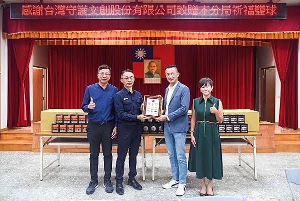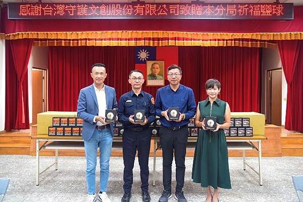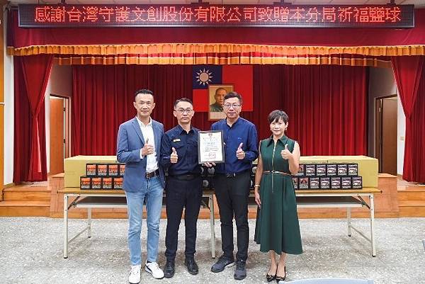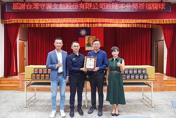 主辦單位之一的台灣守護文創股份有限公司董事長陳仁昌、總經理林國偉有感學甲警分局於安全維護、交通疏導上發揮專業精神,讓鹽祭活動能順利進行,特別致贈「請鹽招財能量晶球」100組給每位辛勞的員警們保平安、添好運;學甲警分局長劉全福亦代表全體同仁頒贈感謝狀及紀念品,感謝企業對警方的肯定與支持。