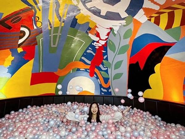 由15,000顆粉色及藍色的海洋球組成的夢幻球池,背景由三位國立高雄大學建築學系碩士班同學手繪創作,透過潑墨、不規則幾何、抽象元素結合不同色塊,呈現出巴塞隆納活力奔放的風格,不僅可以享受球池的樂趣,更是一個藝術氛圍拉滿的打卡熱點。