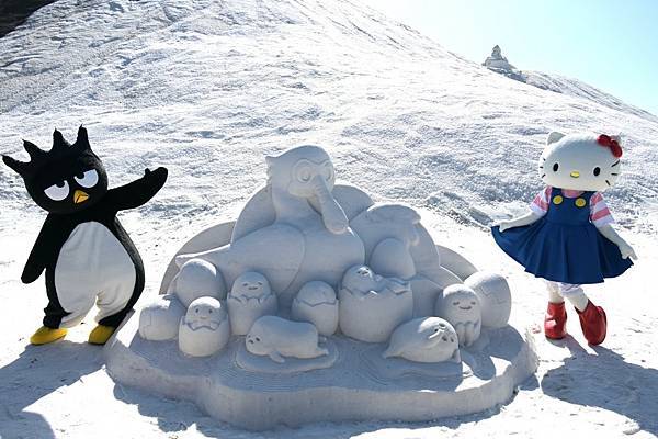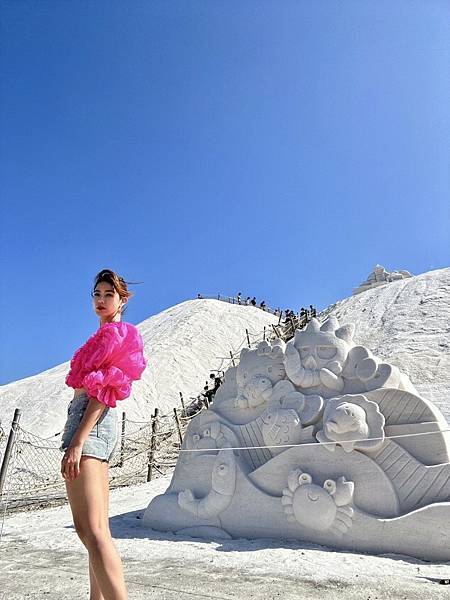 七座特色鹽雕環繞在七股鹽山週邊,由Hello Kitty、酷企鵝、蛋黃哥,再加上交通部觀光署超人氣「喔熊(OhBear)」組長同「萌」,搭鹽鐵、騎自行車暢遊台南400,古往今來,到安平古堡、赤崁樓、七股鹽山等各地景區據點,吃芒果冰、台南新鮮海滋味,還有鹽份洋香瓜,另外酷企鵝也來和我們招潮蟹比大小,蛋黃哥和黑面琵鷺也有經典畫面,都期待歡迎大家來拍照打卡。歡迎大、小朋友前來「一見雙雕藝術季」,讓可愛又有特色的作品融化一家大小的心。