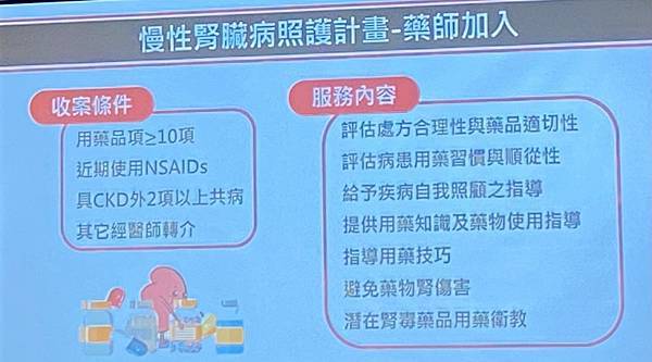 成大醫院藥劑部王豪謙藥師表示,中央健保署為此於2013年建立「末期腎臟病前期病人照護與衛教計畫」,成大醫院也成立跨科部團隊照護,結合醫師、個管師及營養師等各職類人員,藥師於2021年10月加入此計畫,並成立「腎臟病藥師門診」,與團隊共同促進腎臟保健。