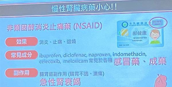 王豪謙藥師指出,非類固醇消炎止痛藥(NSAID)被廣泛用於各種感冒藥與成藥中,可以快速消炎並緩解疼痛,有許多人會依賴這類藥物達到止痛。但NSAID會傷胃、甚至造成胃潰瘍,也是傷腎、造成急性腎損傷的罪魁禍首之一。有些民眾會服用坊間中草藥偏方,也有些人會購買電台販售的藥物,而對於慢性腎臟病的病人,日常用藥要很小心,不可自行服用來路不明的藥物,避免對腎臟造成傷害。