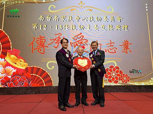 【柿子日報記者李玲/台南報導】南台南家扶中心後援團體「扶幼委員會」日前舉行扶幼主委交接,由第十二任主委黃全永先生交接給第十三任主委康登春先生。在交接典禮中,當黃全永主委將「家扶愛的傳承棒」,透過總會劉國璋副執行長監交,交接到康登春主委的手上,代表「愛的傳承交棒」,也讓愛的志業一棒接一棒,秉持薪火相傳,愛傳愛的精神,繼續協助家扶推展扶幼工作,造福弱勢家庭及兒童。
