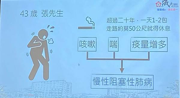 【柿子日報記者李玲/台南報導】43歲的張先生年輕即開始抽菸,長年下來漸漸影響呼吸系統功能,出現呼吸喘、咳嗽、黏液分泌增多的情形,逐漸影響日常生活,即使經過不同的藥物治療,症狀也只能部分改善。肺功能檢查結果為重度呼吸道阻塞性問題,診斷為慢性阻塞性肺病。