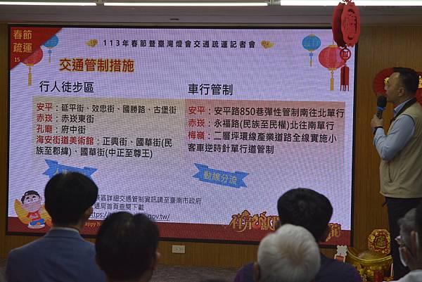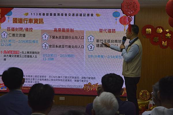 為了能即時處理相關交通情形,春節期間交通局將開設「交通疏運指揮中心」,燈會期間也將進駐2處燈區的燈會指揮中心,監控本市各主要道路的車流情形,即時因應處理各種交通問題,服務專線電話(06)298-8944。