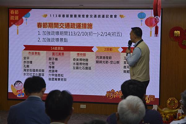 【柿子日報記者李玲/台南報導】因應即將來臨的「2024台灣燈會」及春節連續假期,台南市政府今(15)日舉辦記者會公布交通運輸計畫,燈會安平燈區展期2月3日至3月10日,包含農曆春節假期,高鐵燈區則自2月24日元宵節至3月10日,預計將會吸引大量人潮,南市府也呼籲市民與遊客多使用大眾運輸工具以及活動接駁車,預先規劃好行程,就能在春節與燈會期間輕鬆暢遊台南。