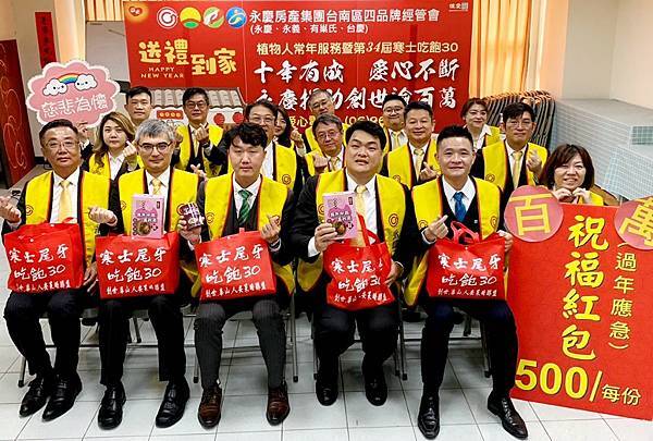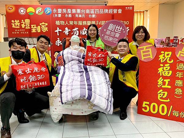 永慶不動產台南區經管會會長呂啟綸表示:「農曆年節就快到了,永慶持續關懷在地弱勢,積極響應愛心活動;希望能透過我們的拋磚引玉,每個人都發揮一點點的力量,就能夠給社會正面良善的影響。」創世基金會表示:「感謝永慶集團十年來持續不間斷的幫助創世植物人家庭,號召眾人集結愛心的力量。每年的寒士吃飽30都是我們的重要活動,弱勢朋友們期待著一份溫暖,盼您伸出援手,一同照亮每個微暗的角落,祝福他們龍年平安順利。」