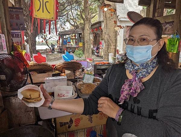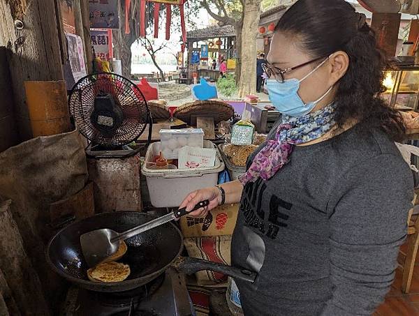 【柿子日報記者李玲/台南報導】台南市學甲區秘境「老塘湖藝術村」園區「古早人ㄟ店」展售台南名產「椪餅」,業者邱怡宣以胡麻油煎蛋加椪餅,被譽為「台灣漢堡」,是遊客遊園必嘗的古早味小點心。