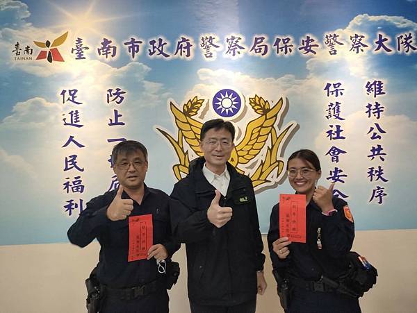 南警保大大隊長蔡宗昌特別肯定同仁春節期間的努力和貢獻,除夕夜除了頒贈加菜金,請副大隊長廖信智至第一中隊與同仁共進年夜飯外,也在年節期間親自前往各中隊、分隊駐地以及線上巡邏地點、2024台灣燈會、月津港燈節勤務崗位慰勞同仁,並送上年節紅包為同仁加油打氣,令保大同仁於犧牲與家人團聚無私奉獻之際,仍能享受年節氣氛,得到溫暖和支持。