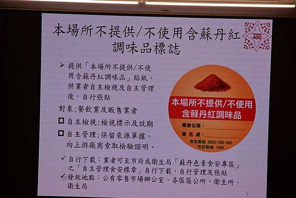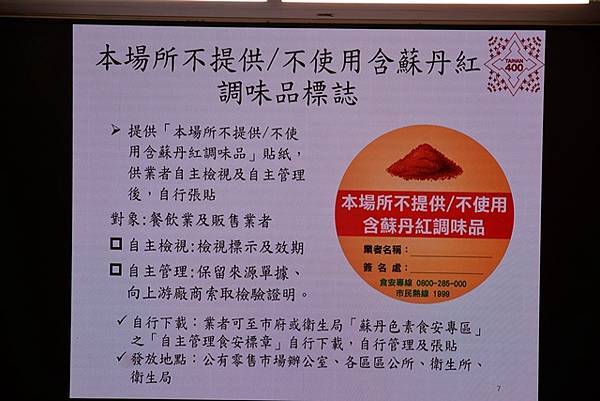 對於餐飲業及零售業,業者自主檢視及自主管理後,於場所未販售或未使用含蘇丹紅調味品,可張貼「本場所不提供/不使用含蘇丹紅調味品」標示,讓民眾清楚選擇及安心消費,同時市府對於張貼標示的店家,將加強定期與不定期稽查或抽驗,揪出不合格業者,若違反規定依法加重處分,為消費者權益嚴格把關,且維護標章的公信力。
