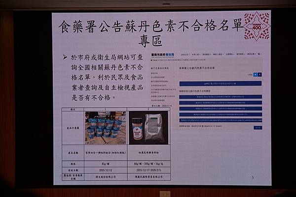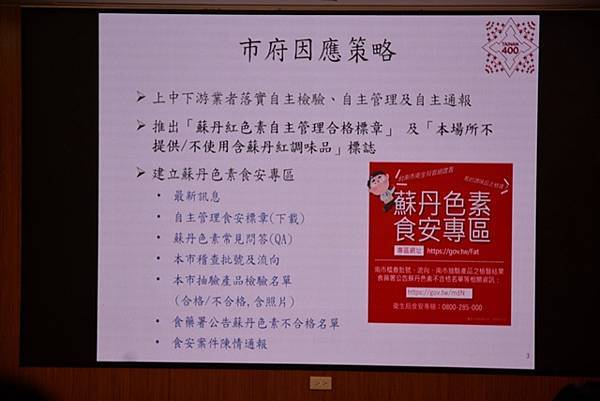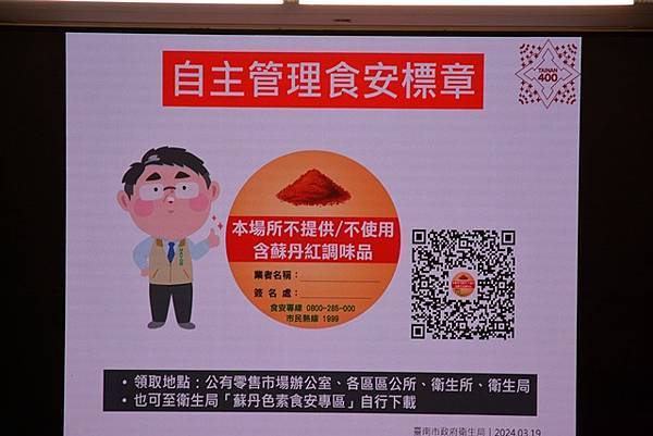 黃偉哲表示,近來蘇丹紅色素事件引發社會高度重視,市府為打造安全無虞的飲食環境,針對源頭的食品原料輸入業者,逐批檢驗蘇丹紅色素合格、溯源管理及自主通報等規定,符合規定者,將核發「蘇丹紅色素自主管理合格標章」。