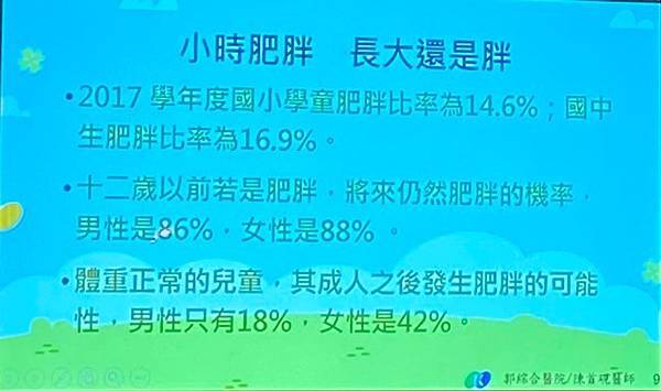 【柿子日報記者林易緒/台南報導】在我國依據教育部學童體位資料顯示,2017學年度國小學童肥胖比率為14.6%;國中生肥胖比率為16.9%。而研究報告指出十二歲以前若是肥胖,將來仍然肥胖的機率,男性是86%,女性是88%;但體重正常的兒童,其成人之後發生肥胖的可能性,男性只有18%,女性是42%,因此肥胖防治應著重於從兒童時期做起,並延伸至整個生命週期,民眾絕對不可輕忽幼童肥胖的問題。