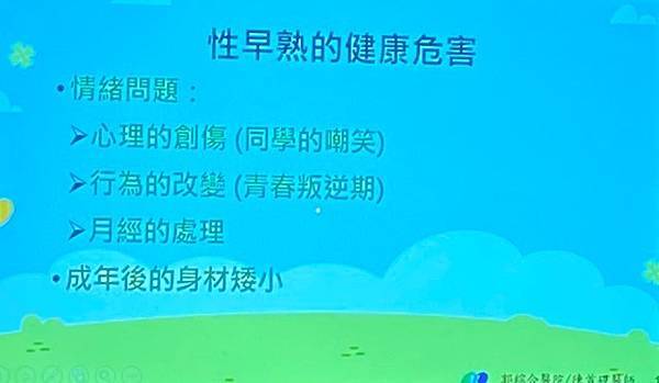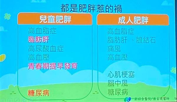 過去已經知道成人肥胖會增加許多慢性疾病的罹患率,包括糖尿病、心血管疾病、高血壓、脂肪肝、痛風等。但如果從小就肥胖,成人後罹患這些疾病的比例將會更高,發病年齡也將會年輕化,甚至近期還發現肥胖的孩童青春期有提早的趨勢,除了在身高的影響外,心理健康方面也有較高比例的社交障礙、憂鬱傾向及自信心不足等問題。