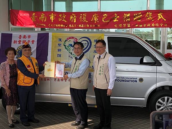 【柿子日報記者林國榮/台南報導】臺南市新豐獅子會用實際行動關懷台南弱勢民眾,集結會長林森男先生及夫人林莊月梅女士之愛心,捐贈1輛價值逾百萬元復康巴士,今(26)日上午於永華市政中心2樓廣場舉辦捐贈儀式,由黃偉哲市長受贈並回贈感謝狀給林森男、林莊月梅賢伉儷,感謝新豐獅子會回饋在地鄉親的善舉。國際獅子會300E-1區總監梁滙榛、新豐獅子會會長張羣欣及立法委員林俊憲、市議員李宗霖、周嘉韋、蔡宗豪等服務處代表都到場參與。